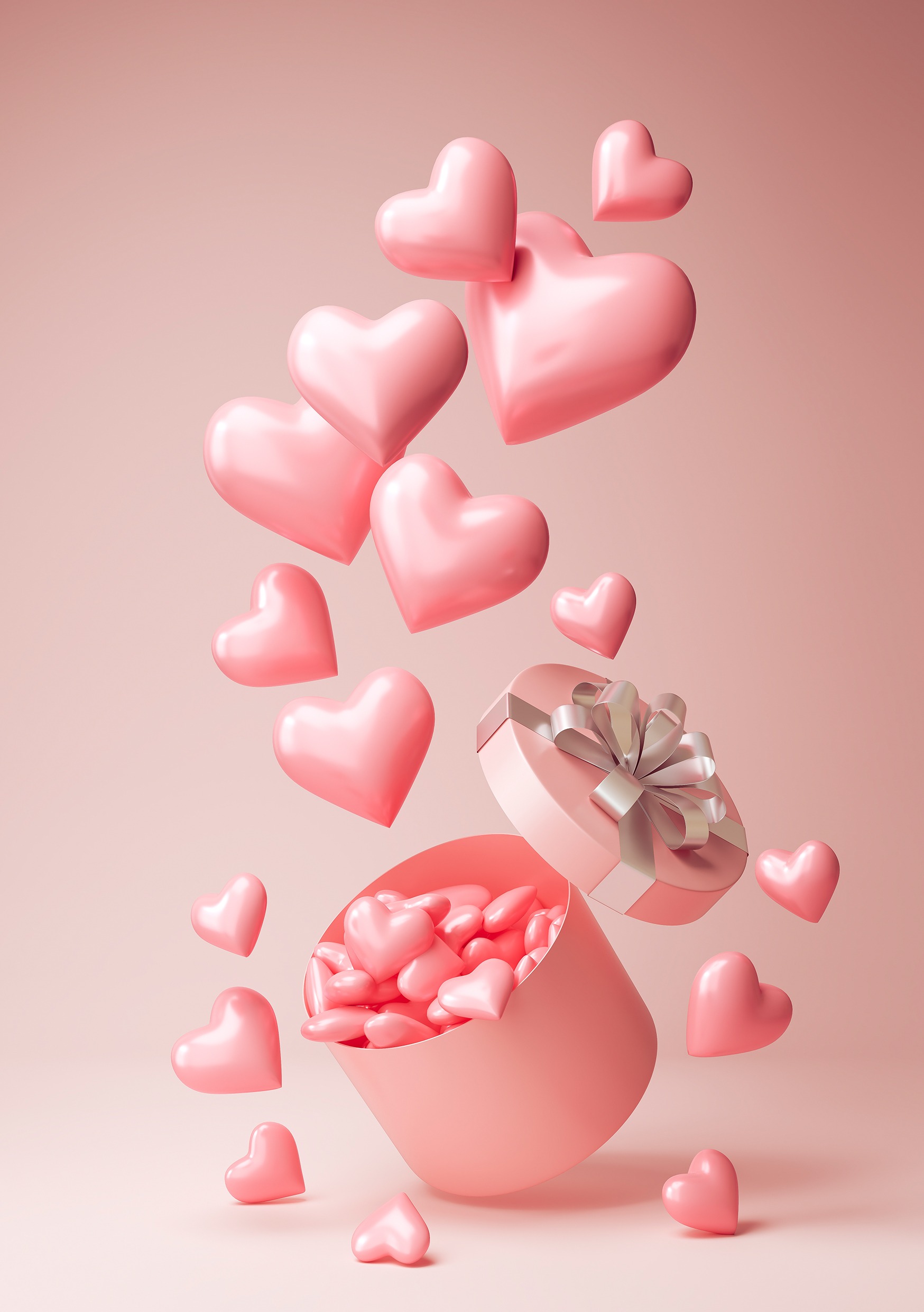 Вид спереди на россыпь розовых сердечек похожих на конфеты, вылетающих из подарочной коробки. Очень нежная работа.