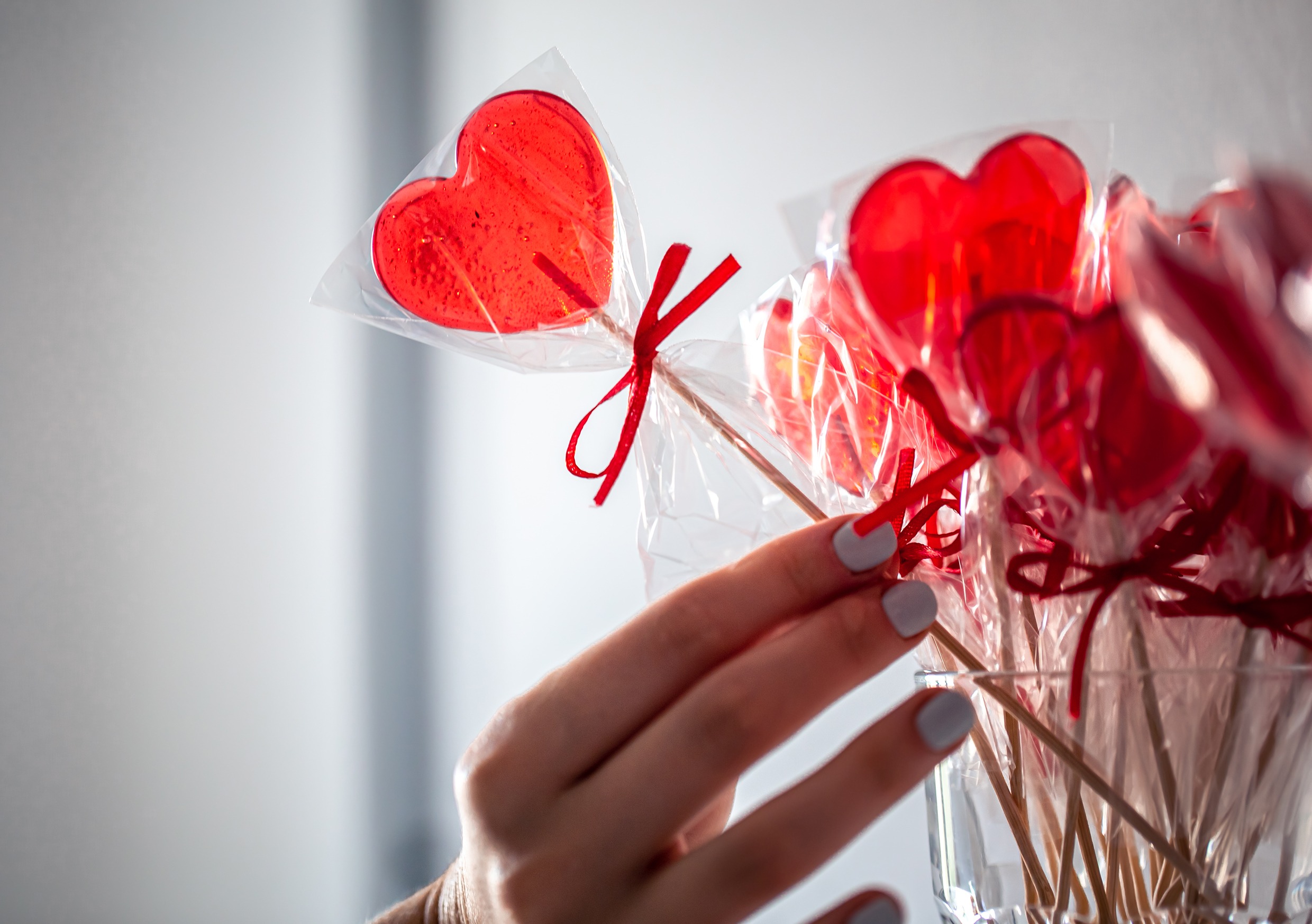 Красные леденцы в виде сердечек на палочке.