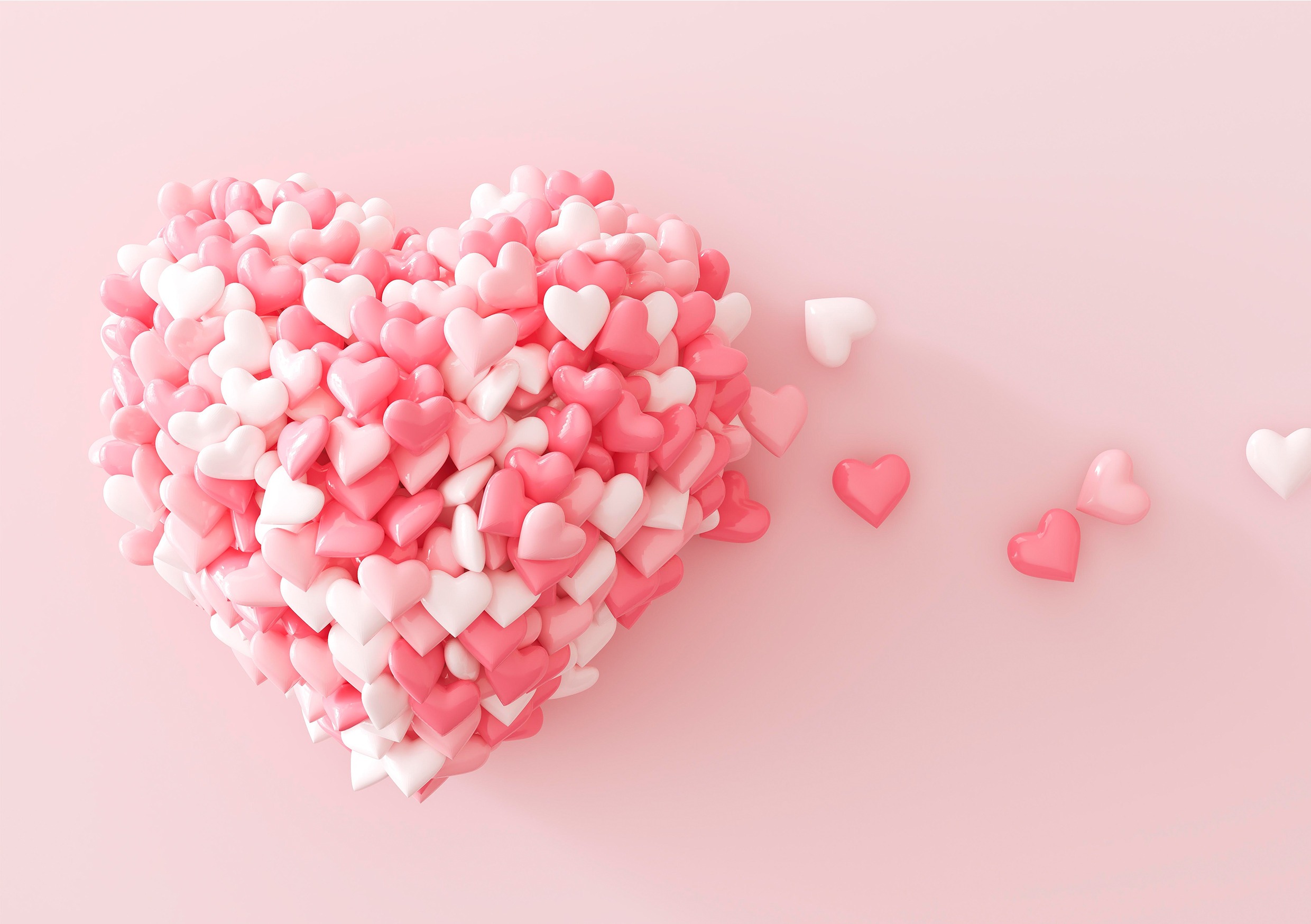 Вид сверху на россыпь розовых сердечек которые выстраиваются в форму большого сердца. Здесь тоже сердечки напоминают конфеты, что придает не только нежность, но и сладость креативу.