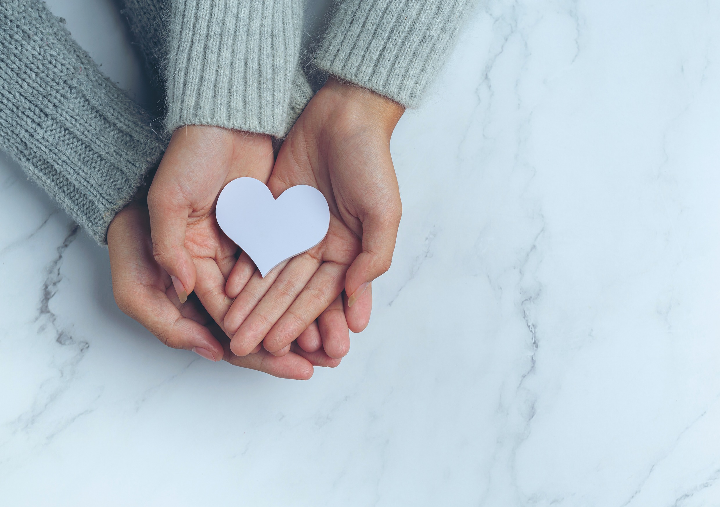 Бумажное сердце лежит в руках влюбленной пары на фоне мраморного стола. Видно, что люди одеты в шерстяные свитера, что дает иллюстрации работу дополнительную теплоту.