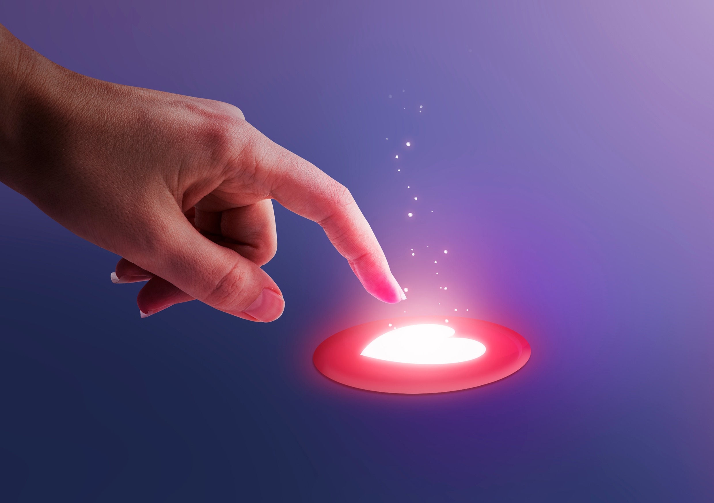 На этом креативе женская рука нажимает на кнопку с изображением сердца.