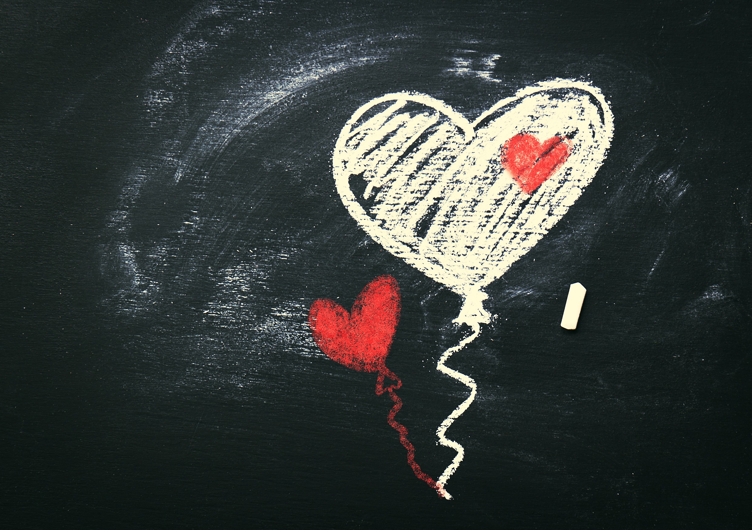 На черной школьной доске мелом нарисованы шарики в виде сердец.